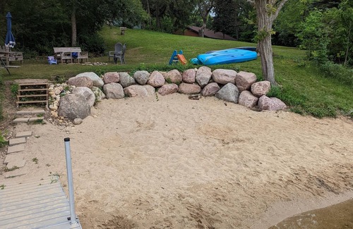 Beautiful 2 bedroom 1 bath cabin, with bunk beds a trundle a queen bed and a sofa bed. On almost an acre with 170' of private lake front and a wooded lot, you will feel like your living in the trees. Located on the very quiet and very beautiful Lake Wandawega. Its a 120 acre quite lake. Perfect for kayaking, fishing, doing a little swimming, and relaxing. . Private beach with pier, fire pit (must bring your own firewood) and seating. If the water is high enough there is a nice swimming area off the beach, if the water is low this season there may be some weeds you will have to swim with. There are two tandem kayaks, and a sixteen foot canoe (life jackets from infant to XXL provided). In the winter you can ice fish, snow mobile and an use the amazing sledding hill right in your backyard. The cabin has been completely updated in 2020. Bedding and towels are provided, beach towels are not provided. Fully equipped eat in kitchen. 10 minutes from Walworth County Fairgrounds, 15 minutes from Lake Geneva, 15 minutes from Alpine. There are local bars, breweries and wineries. Something to do for everyone. Or relax in your peaceful surroundings and do nothing at all. Pets are welcome, but must remain leashed at all times when outside. There are 2 exterior security cameras on the property.
