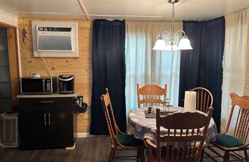 The camp has two bedrooms, one bath, a full kitchen, dining area and living room. TVs are located in both bedrooms, and the living room, with DVD players and fire stick available. The master suite itself provides a cozy, romantic atmosphere, for that private getaway. The second bedroom has bunkbeds, twin over double. with room enough for children or guests. The sofa in the living room can also be converted into a twin bed. Keurig coffee service and microwave available on microwave stand. Regular size refrigerator with icemaker, small stove and pizza sized toaster oven available. On demand hot water heater, with endless hot water supply. Outside, there is a covered front deck with an outdoor kitchen, small table, and a ground level barbecue. Outdoor fireplace on premises. Firewood can be purchased.