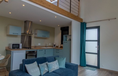 The cottage consists of a 26 m² living room, very bright with high ceilings. There you will find a fully equipped kitchen, a comfortable dining area, a living room with sofa and television. A large bay window gives access to your private terrace not overlooked with garden furniture, electric plancha, sun loungers and parasol. Upstairs awaits you a 10m² bedroom on the mezzanine with a 140x190cm bed, an adjoining bathroom with shower and vanity unit. The toilets are also accessible from the bedroom but separate from the bathroom.