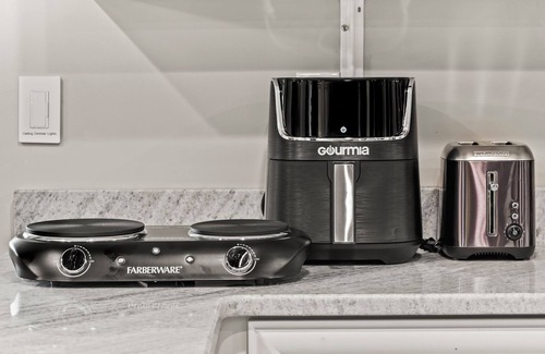 Unwind in the apartment's inviting living room, where you can catch up on your favorite shows on the smart TV or curl up with a good book from the selection provided. The well equipped kitchenette, complete with a mini refrigerator, microwave, air fryer, cooktop burners, toaster, coffee maker, and more, allows you to prepare a small meal and enjoy them at the dining table.
