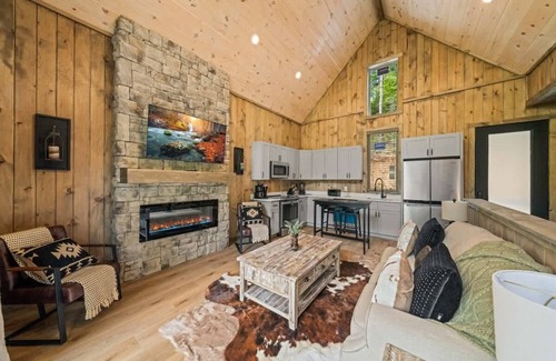 Inside, the cabin welcomes you with an open floor plan designed for comfort and connection. Cozy up in the living area with plush seating or prepare delicious meals in the modern kitchen, fully stocked with appliances and cookware. Dine indoors or step out onto the deck to enjoy your meals with peaceful lake vistas. Afterward, soak your cares away in the hot tub while watching the sun set over the water.