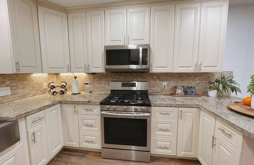 The home also has a full sized custom kitchen. The cabinetry is finished in a moody white with silver hardware. Here you’ll find everything you’ll need to feel right at home! Just behind the kitchen is a large laundry room with washer/dryer and a second closet for clothing storage. We’ve also included luggage storage, full sized hamper basket.