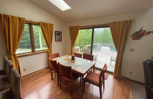 Beautiful mountain home with picturesque views and lots of privacy in Old Timberline. Minutes from ski resort, Black Water Falls, private developer access to Dolly Sods and many other outdoor adventures in Canaan Valley. King Tempurpedic bed in the master. Three bedrooms, 2.5 bathrooms. Loft area with futon that pulls out to a full sized bed. Loft area with bubble hockey table, TV, & Nintendo console. TV with Roku in each room. Indoor hot tub attached to master bedroom & to spacious outdoor deck with propane fire pit and grill. Stocked kitchen.