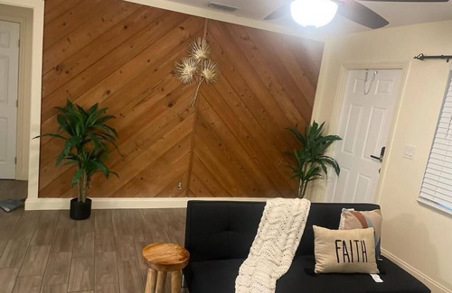 Create cherished family memories in our unique home. This house is equipped with 2 beautiful bedrooms and 1.5 beautiful bathrooms. This house can sleep up to 7 people. This house has a total of five TVs and unlimited Wi-Fi along with a fire stick that shows unlimited channels. Just 4 minutes away from the airport, 10 minutes away from the downtown, Palm Beach, and a quick 10 minute drive to the pristine beach. Step outside to find an extraordinary outdoor bar with TVs and breathtaking views. This area is also equipped with a buzzing restaurant district. The backyard adorned with palm trees, set a serene scene. Spacious bedrooms, ensure everyone’s comfort. Enjoy Florida’s delightful weather as your constant compassion, while exploring, relaxing, or hitting the sun and surf.