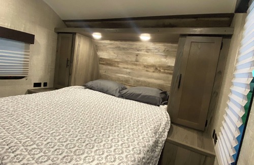 Escape to a serene retreat just 8 minutes outside of Muncie with this cozy 2-bedroom recreational vehicle. Guests can unwind in a fantastic space equipped with WiFi, AC, and heating. Book now and experience the welcoming ambiance of this unique property. The camper is on a personal property, but you will have complete privacy.