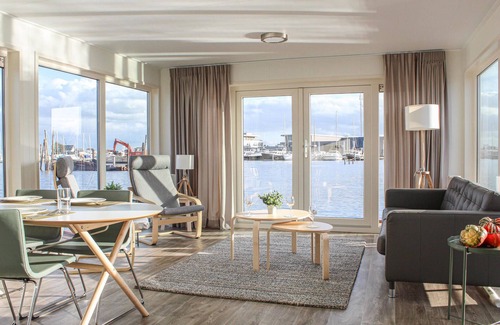 The living room is very modern and brightly decorated. The large windows on all sides of the living room allow you to admire the waterscape from all angles. The open kitchen is fully equipped. There are two bedrooms; one with a double bed and one with two single beds. The bathroom has a toilet, sink and shower.