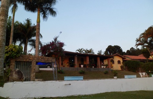 .Chácara Main House 03 bedrooms, living room, kitchen and 03 toilets and 02 toilets with showers in the hall. Barbecue wood stove and oven, panoramic view with funds for dam (fishing), very green, recreation area with swimming pool with waterfall, soccer field or volleyball, billiards, pimbolim, balance seesaw slider and gira-gira is 30 km. Beach Bertioga,