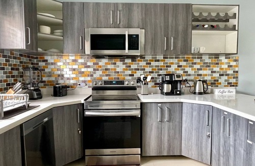 Wheelchair access to the 1st-floor bedroom. Fully stocked kitchen and outdoor patios for relaxation.