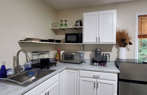 Cozy studio in the woods with a private entrance, perfect for 1-2 guests. It features a small kitchenette (no oven/stove) with essential appliances, including a Keurig, convection oven, and microwave. The bathroom includes a spacious tiled shower. Guests have access to HOA amenities such as beach access, walking trails, a fitness center, and recreational courts. Nestled among tall trees and nature, this location is ideal for those who enjoy outdoor recreation or seek a peaceful retreat.