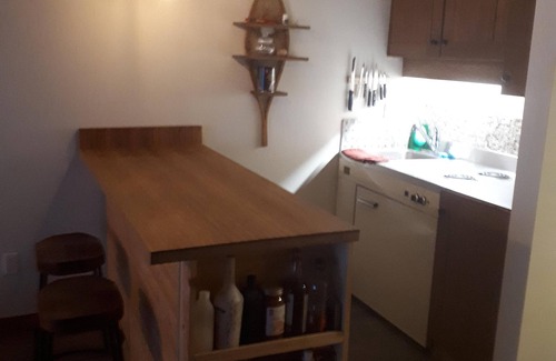 Fully equipped kitchenette with 2 burner stove, small oven, microwave, slow cooker, two mini fridges, and plenty of counter space on the custom built island. There is a French press for making coffee as you watch the snow fall out the Juliette balcony.