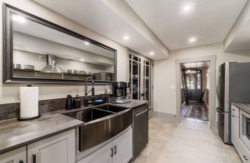 Just outside your suite, a fully stocked shared kitchen is available, equipped with everything you need to prepare meals. The shared back porch offers plenty of ample space for both lounging and dining. Additionally, guests can enjoy spa-style amenities including an outdoor sauna, cold plunge pool, and hot tub. A fire pit and grill are also available—perfect for evening s’mores or a casual cookout. Access to the laundry room is also available upon request. Please note: the kitchen, deck, fire pit, spa amenities, and grill are shared spaces available to all Inn guests.