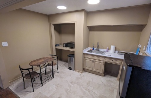 Our suite boasts a comfortable queen bed, a kitchenette, and a bathroom with a shower and tub. The blend of functionality and comfort caters to diverse needs, promising a memorable stay for every guest. Experience the best of both worlds in our thoughtfully designed space, where convenience meets charm.