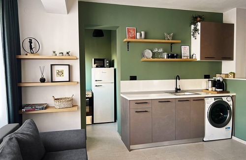 The place has been carefully designed by experts for theultimate self check-in Airbnb experience. It has everything you need for a pleasant stay: a beautifully lit and welcoming living room, with a seating area (the sofa can be converted into a comfortable double bed 140x190), a dining area and air conditioning in the unit. Enjoy a smart TV with cable channels and stay connected with fast WiFi.