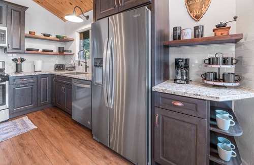With about 4 flights of stairs (about 50 STEPS) to reach the entrance, you are truly immersed in the towering pines surrounding the property. Enjoy an amazing "tree house" experience while relaxing in all the comforts of "home."
