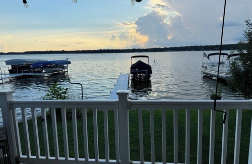 This spacious lake house can comfortably sleep 10 guests. The interior of the home is warm and inviting and features comfortable seating, 3 smart TV's, and a fully equipped kitchen which has a dining room table for 6 and island space for 4. The roofed outdoor patio allows for outdoor relaxation and admiration of the lake view rain or shine. Enjoy your morning coffee or evening wine while grilling! Our home includes an attached 2 car garage. We feel that our lake front property will truly give you the best vacation. Our backyard connects directly to the water, you do not need to cross any busy streets to get into the lake! You will have access to our pier to relax, tan, have a cocktail, go fishing, and more! (Please note the pier is up only during the summer months of June, July, August - Times also may vary depending on the season). The property is on a half acre lot, so there is plenty of grass space to play outdoor games or relax by the bonfire pit. Our 3 bedroom home offers a master bedroom with lake views, a king bed, master closet, and master bathroom! The king room has a plasma smart TV. The cozy queen room is nestled in the center of the home with a flat screen smart TV. Our upstairs loft is the perfect spot for children and teenagers to have their own fun! The loft also has a lake view and features two bunk beds (2 single beds on top of 2 queen beds) which allows for 6 guests to comfortably sleep! Additionally, there is carpet in the loft and stairs going up to the loft making it very comfortable, safe, and cozy for young children. The living room offers three comfortable couches, one which opens into a sleeper sofa for additional comfort for movie nights on our plasma smart TV. The living room has direct lake views and access to the roofed patio. Our open concept kitchen/living room provides direct views of the lake, allowing you to admire Bass Lakes unique sunsets on the water. Be ready to fall in LOVE with all that Bass Lake has to offer! We are just minutes from a unique drive in movie theater, bowling alleys, golf courses, breweries, and more. Additionally, the location of the property is walking distance from two of Bass Lakes most popular restaurant/bars allowing for great nights out!