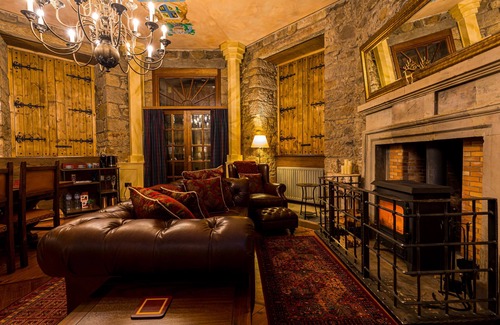 The Temple has a castle-like feel to it and is spread across two floors. There's a sumptuous living space on the ground floor, featuring a large wood burner, elegant leather furnishings, a dining table and a cabinet. Everything you need to light the wood burners is provided free of charge for your convenience. A range of standing lamps and candles provide fantastic atmospheric lighting.