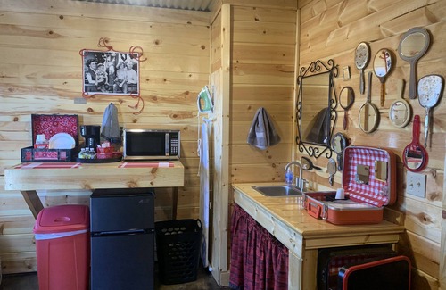 Knotty pine and corrugated tin are used throughout the spacious cabin. Dark stained concrete floors and tin ceilings really add a rustic yet elegant touch. The kitchenette area has a mini fridge, microwave, k cup coffee maker, along with table and chars.