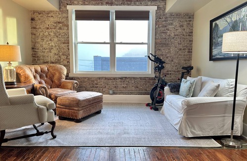 Unique, Cozy, Elegant, Art-filled Apartment on an Historical Town Square! Stay in a turn of the century, Southern town square apartment, rich with character and charm. The "Creative Corner Apartment" is filled with original art, hardwood floors, exposed brick walls and all new utilities and appliances. This is a well appointed 3 room apartment with a king sized bed with attached full bath with tub/shower. There's a washer and dryer in this suite too. The living room has two areas to sit in. One are with the larger couch folds out into a queen sized sofa bed and we have a memory foam topper that makes it feel like a normal bed with a firm yet soft mattress. It's great! There's a second sitting area so that when a guest is there on the sleeper sofa, there's plenty of room to leave that open and still have a living room to sit in. The dining room seats 6 comfortably and more if you want. There's a full kitchen with everything you'd need to cook and clean. 4 guests can easily stay here.