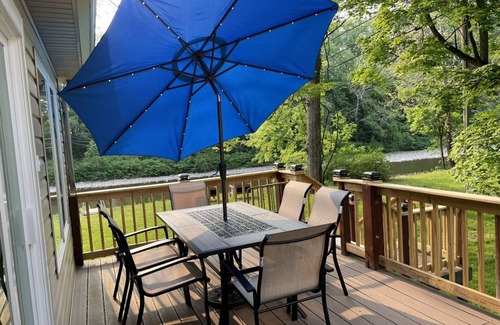 CREEK ACCESS! 3 bedrooms and 4th bedroom/ Den w/ French doors and double bed. 2 large entertainment rooms and bar to creek side room. Lots of space to entertain. Kayaks provided for use. Barbecue or sit by the large fire pit and enjoy the beautiful views of Loyalsock creek