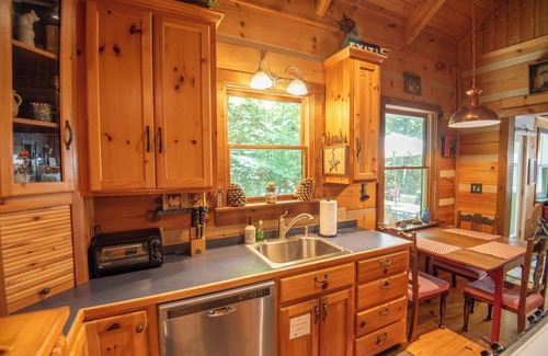 The interior of the cabin is cozy, with a cathedral ceiling, gas fireplace and unique, appealing decor. Tasteful decorating fills the cabin. The open floor plan inspires socializing, as it brings the kitchen, lounging and entertainment areas together, directly adjacent to the large deck. The well-equipped kitchen accommodates wonderful entertaining and at-home meals, complete with a dishwasher for easy clean-up. After dinner, enjoy the fireplace and TV from the attractive and comfortable couches.