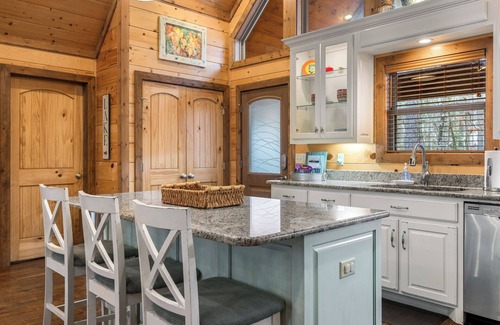 Creekside Tango offers various entertainment options such as four HD TVs, a pool table, a nice selection of board games, plus some toys, books, and puzzles for the littles. Or, you can simply relax in front of the cozy gas-log fireplaces with your favorite beverage and gaze out the wall of windows that frame the beautiful forest. Your dining experience boasts a gourmet kitchen with stainless steel appliances, a gas range, granite counter tops, and numerous gadgets perfect for preparing delicious meals for your family and friends. On the back deck, we’ve provided a stainless gas grill for barbecuing. Additional perks include crockpot, blenders, griddle, waffle iron, toaster, coffee grinder, coffee maker, and a Keurig, (please bring your own cups). You may dine on the back porch, picnic table, or inside at the dining table and kitchen island.