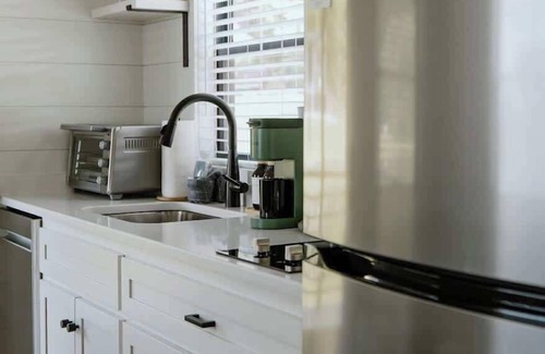 Experience Tiny Home Living like never before at Creekside Hideaway's 15-acre gated community, with stunning views, walking paths, a personal fire pit, BBQ, and patio deck. This new, custom built, modern decor tiny home sits creek side and is across from our private 1.5 acre fishing lake with hot tub boats for rent. Your unforgettable escape awaits.