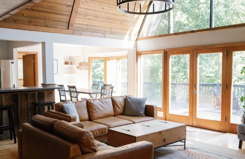 Crockett's Cabin will accommodate up to 14 guests. Enjoy the great room bathed in natural light from floor to ceiling or the striking view from the hot tub on the large deck. Crockett's Cabin is located at Crockett's Run - a Lodging and Event Space on 56-acres in Hocking Hills, OH. Events are typically held on the weekends in the late Spring, Summer, and Fall. Crockett's Lodge is located near the Event Lodge. There are hiking trails + a pond available on-site for Crockett's Run guests.