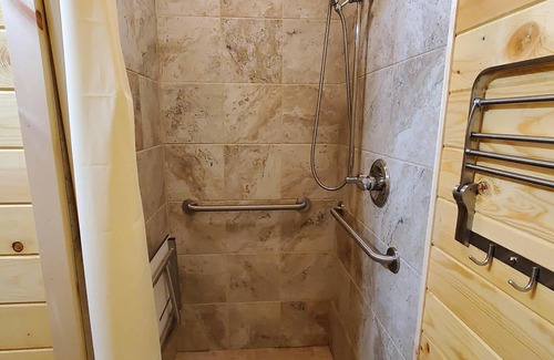 Cabin Six offers a serene retreat, accessible to all amidst nature's beauty. Relax in comfort with a queen bed and full/twin bunk, complemented by modern amenities like Roku TV, Fiber WiFi, and full amenities. Accessible features ensure everyone can partake in Pine Creek adventures and nearby attractions. Please note: Water availability may vary Oct 15- May 1, but the bath house remains open year-round.