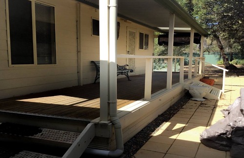 This simple home is set in a tranquil well established garden with many shady trees and lots of birdlife. The house has a comfortable, air-conditioned open plan living with lounge, dining and kitchen.