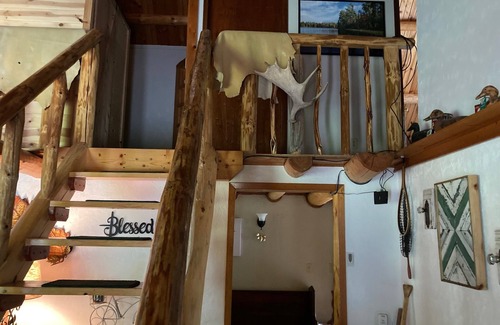 Forget your worries in this spacious and serene space. This custom built log home has 3 bedrooms (All upstairs just so you know) & 2 baths (1 - full, 1 -3/4...All downstairs), large kitchen with all the appliances, open dining room table w/ 6 chairs for the whole gang. There are a total of 5 beds upstairs...(2) queens, (2) twins and a day bed + a new and comfortable memory foam pull out sofa in the living room.