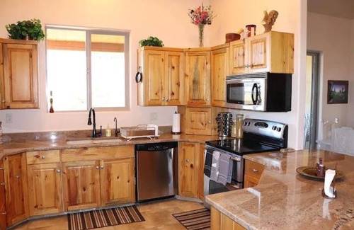 As you pass through the private gate at the entrance of Mount Zion View Ranch, you will have unobstructed views beyond the horse pasture of Zion National Park and Smithsonian Butte. You will have a sense of peace as you drive along the well maintained gravel lane that will lead you through cedar pine groves to the home on the hillside of the upper 40 acres. The site of this exceptional and unique home was thoughtfully selected to display the most spectacular views of the valley. If you are looking for a private retreat, this is the place for you. As you ascend the outdoor stairs to the deck and upper entrance of this well built home, you will be treated to a spectacular overview of the property. The front main door will take you into the well decorated and comfortable great room with large windows. The great room sofa can comfortably seat 10 people. The kitchen is large and well equipped. Also on the upper floor is a large master suite with a king bed, private access to the deck and indoor jacuzzi tub. There is also a secondary bedroom with a queen size bed and the large sofa in the great room also folds out into a sofa sleeper. The main floor laundry room is adjacent to the kitchen and has access to a back deck with stairs to the back yard. The lower level of the home can be accessed from interior stairs or from an outside entrance. It has the "horse lovers" bedroom with a queen bed and the second bedroom has both a queen and twin size beds. There is a full bath, kitchenette and lower great room. The great room has a comfortable trundle bed with two twin size mattresses,