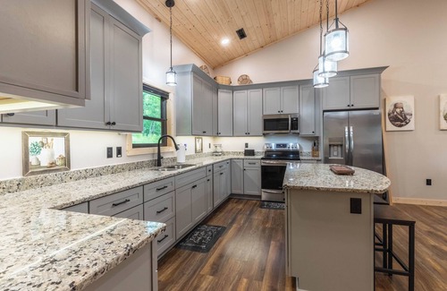 Step inside and be greeted by a cheerful, rustic ambiance. The fully stocked kitchen becomes the heart of your gathering, equipped with everything you need to whip up delicious meals.