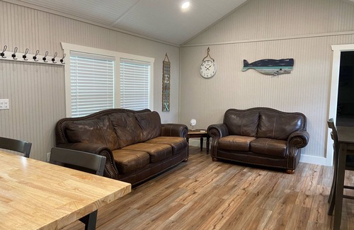 This cute cabin is down the road from The Coves golf course, Safe harbors marina, Drunken Rooster restaurant & close to the water. There is a fire pit right outside the cabin. Has kitchen with everything you'll need to cook. Roomy living area with TV