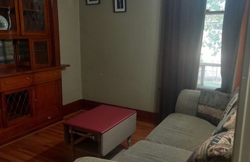 Lots of parking, laundry in the house, full kitchen, two bedrooms plus living room and front sitting room can be used as an office.
