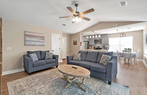 Welcome to your pet-friendly retreat nestled beneath towering oak trees adorned with Spanish moss. This charming home accommodates up to six guests in a spacious layout featuring a king bed, queen bed, and two twin XL beds, ensuring everyone's comfort.