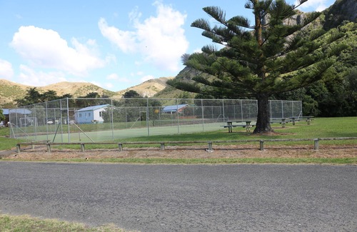 The bach is right opposite the community tennis court with a children's play ground on the beach front.