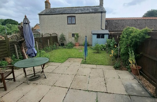 The holiday home with a patio and garden views features 2 bedrooms, a living room, a flat-screen TV, an equipped kitchen with an oven and a microwave, and 1 bathroom with a walk-in shower. Towels and bed linen are featured in the holiday home. The property has an outdoor dining area.