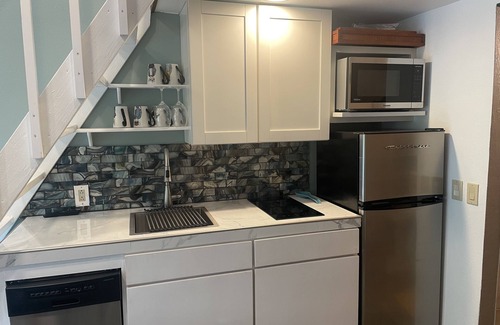Fully remodeled studio with loft/bed queen memory foam mattress and futon (full size) couch. Small fridge, microwave, dishwasher and 2 burner cooktop with exhaust fan. Small bathroom.