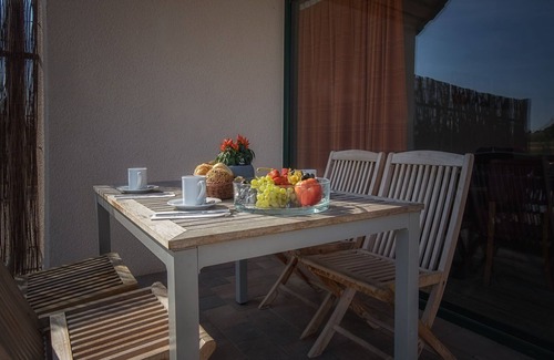 "Dünenhaus Comfort", 2-room terraced house 57 m2. Bright, tasteful furnishings: living/sleeping room with 1 sofabed, Scandinavian wood stove, dining table, satellite TV and radio. Exit to the terrace. 1 double bedroom. Open kitchen (oven, dishwasher, 4 ceramic glass hob hotplates, toaster, kettle, electric coffee machine). Shower/WC, Sauna. Underfloor heating. Terrace partly roofed. Terrace furniture, deck chairs (2). View of the lake. Facilities: safe, children's high chair, baby cot (extra), hair dryer. Internet (WiFi, free). Parking at the house. Please note: non-smoking house. Maximum 1 pet/ dog allowed. Smoke alarm. The sauna can also be an infrared sauna. Private beach access.