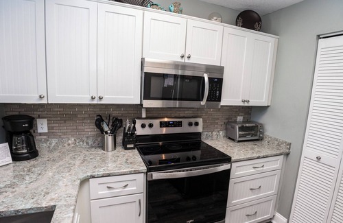 The open-concept living area is a welcoming space to gather, complete with a cozy queen-size sleeper sofa, a flat-screen TV with cable, and sliding glass doors that open onto your private balcony. Whether you're starting your day with coffee or winding down with a sunset view, the balcony is your front-row seat to the beauty of the Gulf.