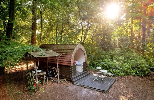 Nestled in a magical clearing within 10 acres of private ancient woodland near the historic market town of Newbury, Bluebelle Pod offers a truly unique and peaceful glamping experience. Ideally located halfway between London and Bath, it's the perfect escape for couples or small families looking to unwind, explore, and reconnect with nature.(Note: Since the text was already in English, no translation was necessary.)Sleeping two adults in a cozy double bed and up to two children (aged 12 and under) on fold-out Z-beds, the pod is thoughtfully designed for comfort. Inside you'll find electricity, heating, a mini fridge-freezer, a kettle, toaster, and all your essential crockery, cutlery, utensils, wine glasses, and even plastic dining items for little ones. Tea, coffee, sugar, and milk are provided, and all water on site is safe for drinking.Just next door is your own private bathroom with a piping hot shower, flushing toilet, and sink, while outside there's a decked seating area perfect for lazy mornings or starlit evenings. The undercover cooking area includes a gas stove and charcoal BBQ, and there's a well-equipped washing-up area too.The communal undercover seating area and large brick-built firepit with log seating sit right beside the pods and form the cosy heart of the clearing – perfect for sharing stories or toasting marshmallows as the sun goes down.Children will love the freedom to explore the woodland, build dens, swing on the tire swing, and spot wildlife. Guests have full access to the entire woodland area, where ducks, chickens, geese, peacocks, dogs, and even a few feral cats roam freely. Wild deer, foxes, and bats are often seen too, adding to the magic of this secluded spot.The local village of Woolton Hill is within walking distance and has a shop, post office, three friendly pubs, and a monthly village market. Nearby attractions include Highclere Castle (famously known as Downton Abbey), 4 Kingdoms Adventure Farm Park, Newbury Racecourse, The Chase nature reserve, canal boat trips, museums, and endless countryside walks and cycle trails.Please note: if the pod is at full human occupancy, we're unable to accommodate dogs due to limited space, but they're more than welcome when guest numbers are lower. Guests should bring their own wood, charcoal, and tea lights. A smoke alarm, fire blanket, fire extinguisher, and first aid kit are all provided for safety.