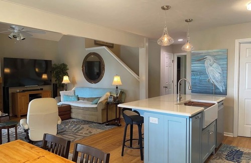 Relax in the rocking chairs on the back porch watching dolphins jump in the water while the sea breeze blows gently on your face. Gaze at the sunrise while sipping coffee on the deck overlooking the saltwater. Have a romantic glass of wine on the dock as the sun sets over the water. Watch your children fishing, crabbing, and swimming from the dock in the back yard. Swim in the pool next door overlooking the saltwater. Golf on two 18 hole Tom Fazio golf courses along the tidal creeks leading to the intercoastal waterway.