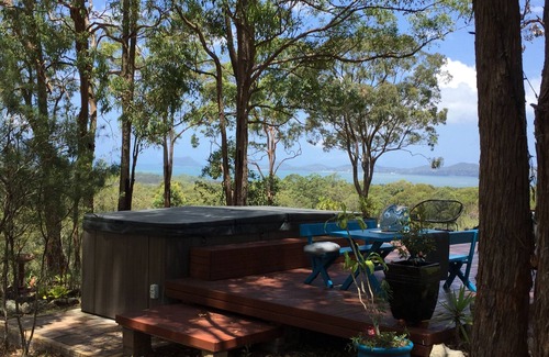 Two cosy,self contained studio cabins (well separated) set on 25 bush acres overlooking the beautiful waterways of Port Stephens, Tea Gardens & Hawks Nest. Good sized decks with personal BBQ's so you can relax and take in the fabulous view or unwind in our large outdoor heated swimspa. Just a our 15 minute drive to closest towns of Hawks Nest & Tea Gardens for shops, cafes, pub, clubs, ferry (to Nelson Bay), surf & Bay beaches, etc.