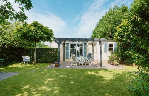 The chalet has a beautiful laminate floor and there is a sliding door to the backyard, where you are nicely protected under the pergola. Everything has double glazing and central heating.