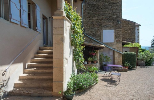Passionate about wine and its various trades, having herself worked on a family farm, Marie-Hélèn welcomes you in an elegant authentic 17th century Burgundian residence steeped in history, carefully restored in accordance with the rules of the art - superb building full of character, endowed in particular with a traditional sheltered "Mâconnaise gallery" - nestled in a peaceful setting within a charming & intimate enclosed backyard, vegetated & flowered, accessible by an original private covered passage - of the "traboule" type - bordering an alley & the village square. In the heart of a picturesque charming little wine-growing village typical of the Macon countryside (one of the 4 rare villages making up the prestigious Pouilly-Fuissé cru), nestled on the crests of an exposed panoramic hillside (exceptional belvedere overlooking the balcony the city of Mâcon, the Saône valley & Savoyard Bresse, and offering a sublime unobstructed view as far as Mont-Blanc on a clear day!), in the hollow of a sumptuous hilly landscaped setting, succession of vast vineyards & wooded hills . Spacious gîte with very good comfort. Beautiful volumes. Warm country character, mixing modernity & traditions, between contemporary spirit and the soft exotic atmosphere of an old house (fireplace mantel, beams, molded doors, rare original stone slab floor). Pleasant sheltered balcony-terrace, nestled under the historic "Mâconnaise gallery", completed by a large gravel terrace "on the courtyard" (exposed & shaded). Composition: Terraced village house adjoining the owners' home (total independence). Electric heating. Raised ground floor: living room-kitchen, living room (single bed 90x190cm), 1 bedroom (2 single beds 90x190cm), bathroom (shower / wc), laundry area. Balcony-terrace + private enclosed courtyard-terrace. Table tennis table. Free public parking on site. Shops & services 4 km. Electric vehicle charging point available in the town