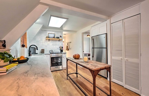 INDOOR LIVING: Flat-screen Smart TV w/Netflix & Hulu, hardwood floors, high ceilings, wood-burning stove
