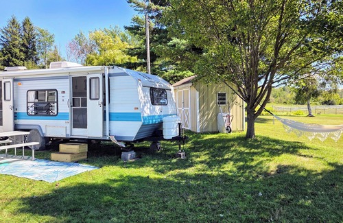 Nestled in Oswego, this delightful remodeled vintage camper offers guests a cozy studio setup with 1 full bed and 1 futon. The bathroom comes equipped with a hair dryer for added convenience. The kitchen has everything you need to cook or even bake plus complementary coffee. With heating and AC, you'll stay comfortable no matter the weather. A great place to call homebase while you're away, we hope you enjoy your stay.