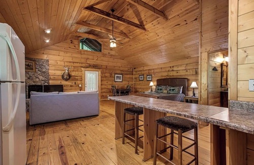 This modern log cabin is a large studio with all of the 'bells and whistles' !!! There is a very important looking king size bed, gorgeous mountain decor, fold out sofa, Adirondack chairs for the porch and old-fashioned porch swing. Full kitchen, one bath, 65" Smart TV with Fast WiFi. Tucked into the woods with a BIG hot tub, this is perfect place to celebrate or honeymoon. Come with friends. Or be selfish and bring her just to be together. Well, you could bring the pup too.