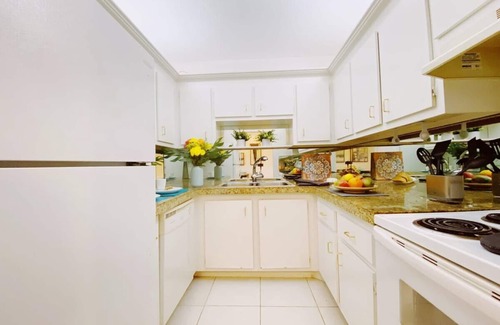 The fully equipped kitchen offers everything you need, whether you're reheating leftovers from a nearby restaurant or cooking a full meal. A dining table for four provides a perfect setting for meals or socializing. The bedroom is a serene retreat, featuring ample closet space and a luxurious 12" pillow-top mattress that guarantees a restful night's sleep. Like the living room, the bedroom also includes a Smart TV for your entertainment.