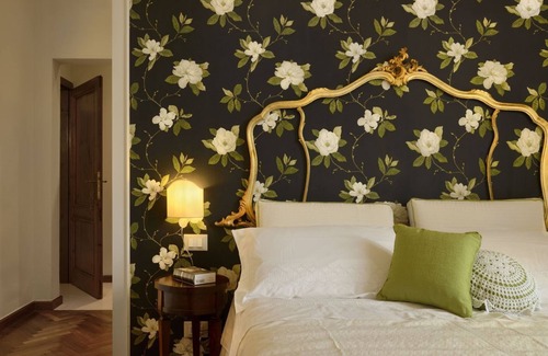 The “Nero su Bianco” deluxe room has pleasant views and parquet floors by Siam. Located on the first floor of the Villa, it has a bathroom with shower, antique Tuscan furnishings and features such as floral wallpaper.